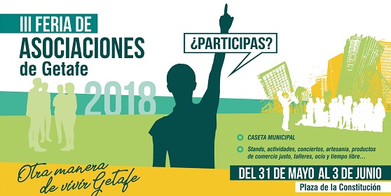 La Feria de Asociaciones de Getafe, que celebra su tercera edición del 31 de mayo al 3 de junio, contará con distintos ‘stands’ en la plaza de la Constitución, donde habrá venta de artesanía y productos de comercio justo, talleres, actividades de ocio y tiempo libre y conciertos.