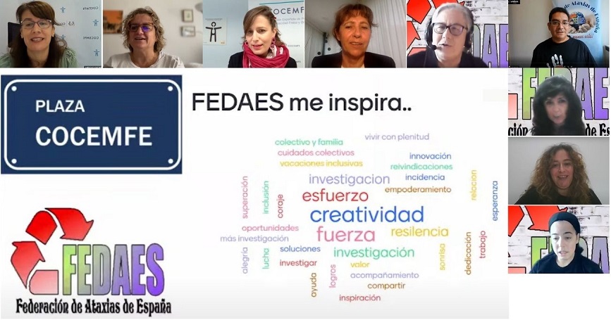 “Las tres palabras que para mí se identifican con FEDAES después de esta Plaza COCEMFE son ‘creatividad’, aportando y reforzando siempre cosas nuevas, ‘esfuerzo’ por poner en primer lugar a las personas con ataxia y muy vinculada con ello, la ‘fuerza’ que transmitís y dais a las personas con las que trabajáis”, ha explicado Elena Antelo, directora de COCEMFE, en relación a una de las acciones participativas realizadas, consistente en la creación de una nube de palabras entre todas las personas asistentes.
