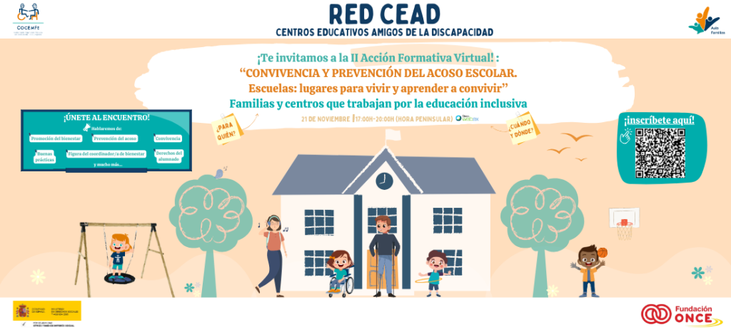 La Confederación Española de Personas con Discapacidad Física y Orgánica (COCEMFE), en colaboración con Ministerio de Derechos Sociales y Agenda 2030 y Fundación ONCE celebra, el próximo martes, 21 de noviembre, la segunda parte de la Jornada de la Red CEAD (Red de Centros Educativos Amigos de la Discapacidad) ‘Convivencia y prevención del acoso escolar. Escuelas: lugares para vivir y aprender a convivir’.