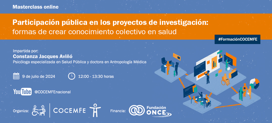 La Confederación Española de Personas con Discapacidad Física y Orgánica (COCEMFE), en el marco de su Plan de Formación 2024, organiza el próximo martes 9 de julio de 12.00 a 13.30 horas la Masterclass ‘Participación pública en los proyectos de investigación: Formas de crear conocimiento colectivo en salud’, que se podrá seguir en YouTube, con subtitulado en directo.