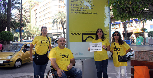 COCEMFE Alicante presentó la nueva imagen de su Campaña de sensibilización sobre la accesibilidad al medio físico en la provincia de Alicante, ABRAMOS PASO, con una acción de calle en la que inunda de amarillo las principales zonas del centro de la ciudad, con la participación de alrededor de cincuenta personas.