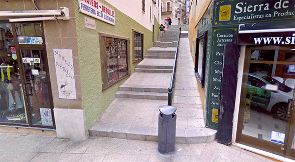 Ahora esta calle tiene una escalera convencional en dos tramos y una rampa. Mientras que la iniciativa que defienden las citadas organizaciones es que haya un ascensor y una escalera convencional, la propuesta del Ayuntamiento es dejar una rampa en un lateral, una escalera mecánica en el centro y una escalera convencional en el otro con un trazado y peldaños más cómodos que los actuales.