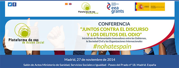 Bajo el título “Juntos contra el discurso y los delitos de odio” y, con el objetivo de poner en valor la eficacia de la colaboración entre ONG y administraciones públicas en la lucha contra los delitos de odio, se celebrará en Madrid en el Ministerio de Sanidad, Servicios Sociales e Igualdad, el 27 de noviembre, esta Conferencia organizada por la Plataforma de ONG de Acción Social en el marco del Programa de Ciudadanía Activa.