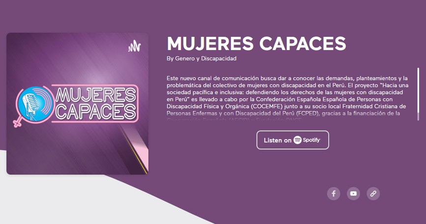 Las mujeres con discapacidad que participan en el proyecto “Hacia una sociedad pacífica e inclusiva: defendiendo los derechos de las mujeres con discapacidad en Perú”, desarrollado por COCEMFE han lanzado hoy 25 de noviembre, en el marco del Día Internacional de la eliminación de la violencia contra las mujeres, el primer canal de podcast denominado “Mujeres Capaces” y que difunde los testimonios de mujeres con discapacidad.