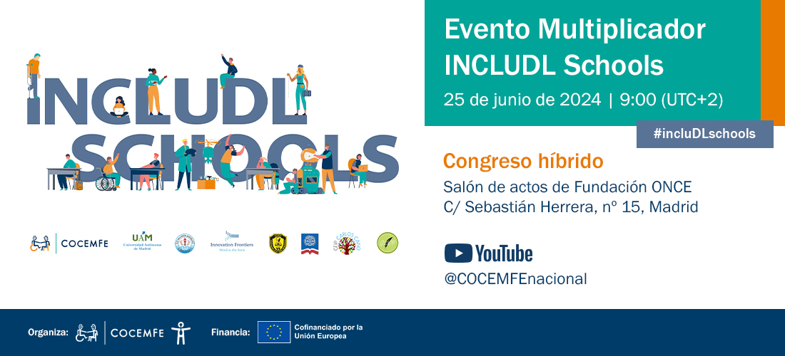 La Confederación Española de Personas con Discapacidad Física y Orgánica (COCEMFE) celebra el próximo 25 de junio, de 9:00 a 14:30 horas, la Jornada “Evento Multiplicador INCLUDL Schools”, que tendrá lugar en el Salón de actos de Fundación ONCE ubicado en la calle Sebastián Herrera, nº 15, Madrid. El acto, será retransmitido también online a través de Youtube, en castellano e inglés.