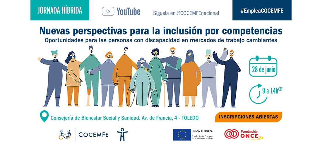 📌La Confederación Española de Personas con Discapacidad Física y Orgánica (COCEMFE) en el marco del Proyecto Decid-E, organiza el próximo 28 de junio de 9.00 a 14.00 horas la jornada ‘Nuevas perspectivas para la inclusión por competencias: Oportunidades para las personas con discapacidad en mercados de trabajo cambiantes’, dirigida a personal técnico, entidades públicas, privadas y organizaciones del Tercer Sector, personas con discapacidad y sociedad en general.Enmarcada en el Año Europeo de las Competencias, la jornada pretende abordar aspectos como la brecha competencial en Europa y España o los ecosistemas de innovación e intercambio. También contará con una mesa redonda sobre colaboración y transferibilidad transnacional de buenas prácticas en la inclusión laboral de grupos vulnerables en la que intervendrán responsables técnicos de proyectos europeos de Francia, Portugal, Irlanda, Eslovaquia, Chequia y Noruega, entre otros. El evento se cerrará con la presentación de los proyectos ‘Territorios Cero Desempleo de Larga Duración’ de Francia y el propio proyecto organizador, ‘Decid-E’.Esta jornada que se desarrollará en la Consejería de Bienestar Social y Sanidad de Toledo y contará con intérprete de lengua de signos, tendrá un formato híbrido y también podrá seguirse en YouTube en el siguiente enlace. 💻Inscripción gratuita: https://forms.office.com/e/SwNANHRZG1Esta jornada forma parte del proyecto Decid-E, Desarrollo de Redes de Cooperación Transnacional para la Inclusión Laboral de las Personas con Discapacidad, está cofinanciado por el Fondo Social Europeo y Fundación ONCE, en el marco del Programa POISES (Programa Operativo de Inclusión Social y Economía Social, 2014-2020).ℹ️ Más información en: este formulario de contacto o el teléfono 91 744 36 00.
