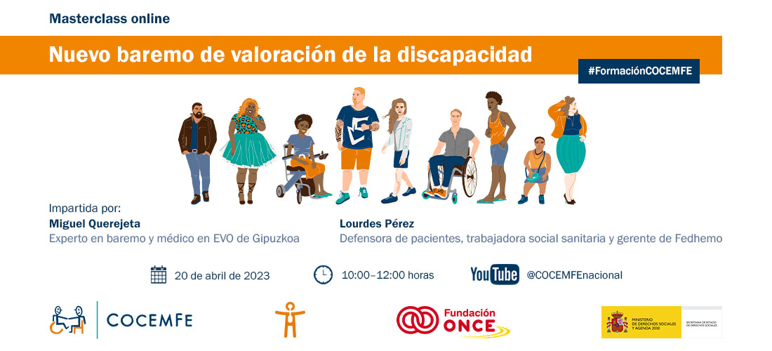 📌La Confederación Española de Personas con Discapacidad Física y Orgánica (COCEMFE), en el marco de su Plan de Formación 2023, organiza el próximo jueves 20 de abril de 10.00 a 12.00 horas la Masterclass ‘Nuevo Baremo de valoración de la discapacidad’, que se podrá seguir en YouTube, con subtitulado en directo. Impartida por Miguel Querejeta, experto en baremo y médico EVO de Gipuzkoa y Lourdes Pérez, defensora de pacientes, trabajadora social sanitaria y gerente de Fedhemo.Profundizaremos en los aspectos novedosos del nuevo procedimiento para el reconocimiento, declaración y calificación del grado de discapacidad, en aquellas situaciones que a partir de ahora sí serán valoradas en el nuevo baremo, en la Clasificación Internacional del Funcionamiento y la discapacidad (CIF), así como en la importancia y el papel de las entidades y sus profesionales para acompañar a las personas con discapacidad en este proceso.💻 Inscripción gratuita: https://forms.office.com/e/gw0HXJ3sUqEsta Masterclass forma parte del Plan de Formación 2023 de COCEMFE, financiado por Fundación ONCE, que tiene como objetivo responder a las necesidades de las personas con discapacidad física y orgánica y su Movimiento Asociativo, fortalecer el cumplimiento del propósito de la organización y proporcionar herramientas al personal técnico, directivo y voluntario de las mismas para la mejora del desempeño de sus labores profesionales. La difusión de esta masterclass es posible gracias a la subvención nominativa del Ministerio de Derechos Sociales y Agenda 2030 a favor de COCEMFE para el sostenimiento económico-financiero de su estructura central y la de sus entidades asociadas, recogida en la Ley de Presupuestos Generales del Estado para el año 2022 (Ley 22/2021 PGE).ℹ️ Más información en: este formulario de contacto o el teléfono 91 744 36 00.