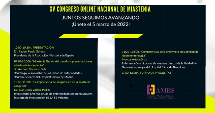 El congreso será inaugurado por Raquel Pardo Gómez, presidenta de AMES y, posteriormente, darán comienzo las ponencias con “Miastenia Gravis: del pasado al presente. Líneas actuales de tratamiento”, a cargo de Antonio Guerrero Sola, responsable de la Unidad de Enfermedades Neuromusculares del Hospital Clínico de Madrid y “La importancia del diagnóstico de la miastenia congénita”, a cargo de Juan Jesús Vílchez Padilla, investigador emérito del Grupo de Enfermedades Neuromusculares del Instituto de Investigación Sanitaria La Fe (IIS La Fe) de Valencia. Cerrará el programa “Competencias de la enfermera en la Unidad de Neuroinmunología”, ponencia a cargo de Montse Artola Ortiz, coordinadora de ensayos clínicos de la Unidad de Neuroinmunología del Hospital Clínic de Barcelona.