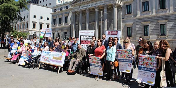 Una representación de la Federación Española de Asociaciones de Espina Bífida e Hidrocefalia (FEBHI) encabezada por la presidenta Carmen Gil, con Margarita Mefle vicepresidenta de FEBHI y presidenta de FAEBA (Federación de Espina Bífida de Andalucía) y junto a sus asociaciones de Espina Bífida (EB) de Madrid, Bilbao, Navarra, Cataluña, Valencia, Alicante, Albacete, Murcia, Granada, Málaga, Cádiz, Campo de Gibraltar, Sevilla y Huelva, acompañados de Daniel-Aníbal García (secretario de Organización de COCEMFE), Javier Font (presidente de FAMMA COCEMFE Madrid y vicepresidente de CERMI-Madrid) y de Luis Alonso (gerente de CERMI), se han concentrado esta mañana a las puertas del Congreso de los Diputados (Madrid) para dar su especial acogida al nuevo Gobierno.